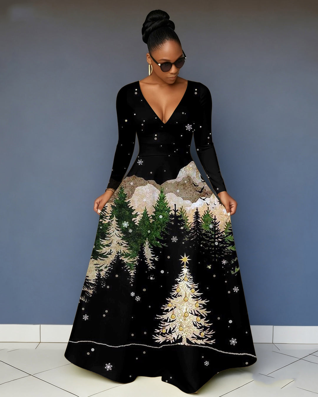 V Neck Christmas Trees and Snowflakes Long Sleeves Maxi Dress