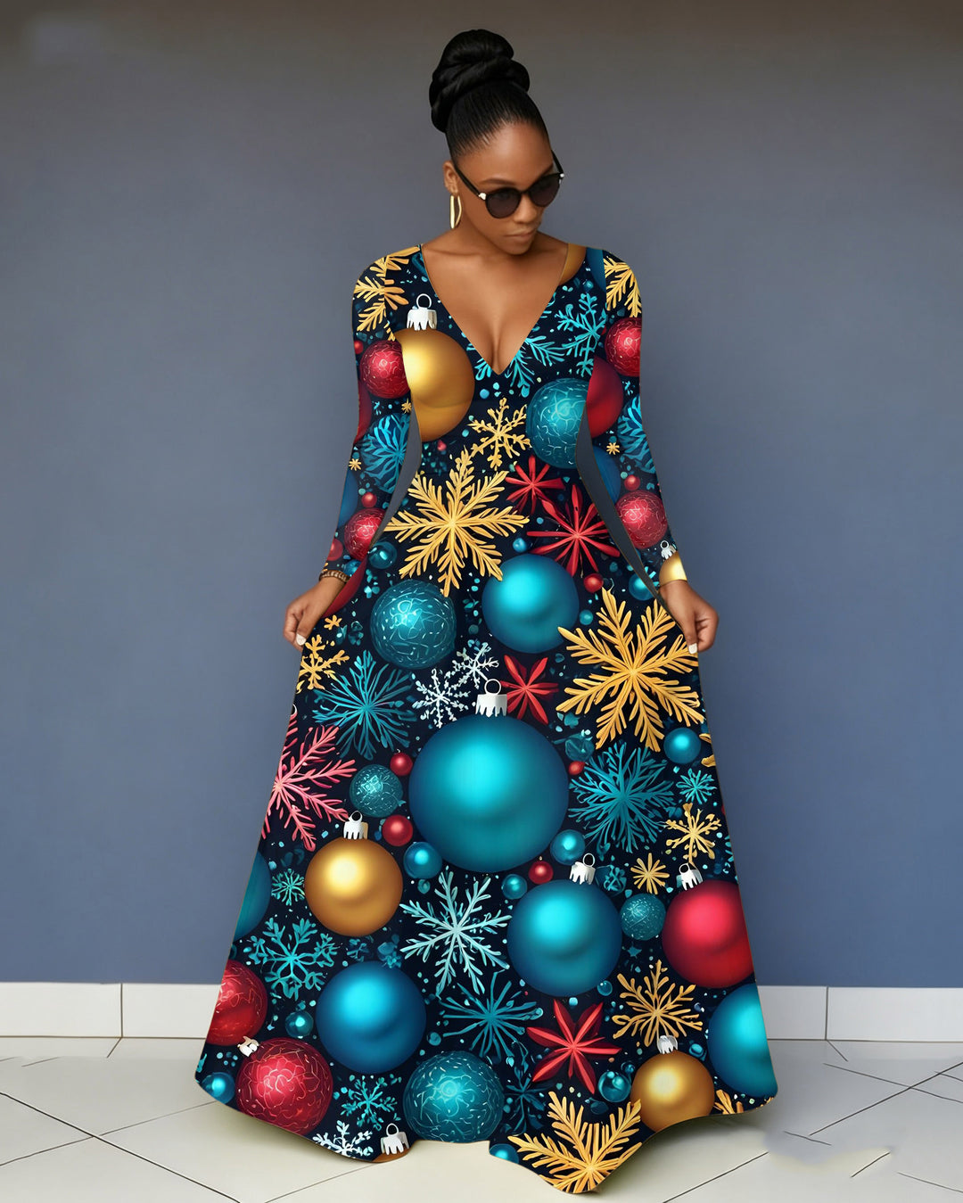 V Neck Colorful Christmas Balls Long Sleeves Maxi Dress