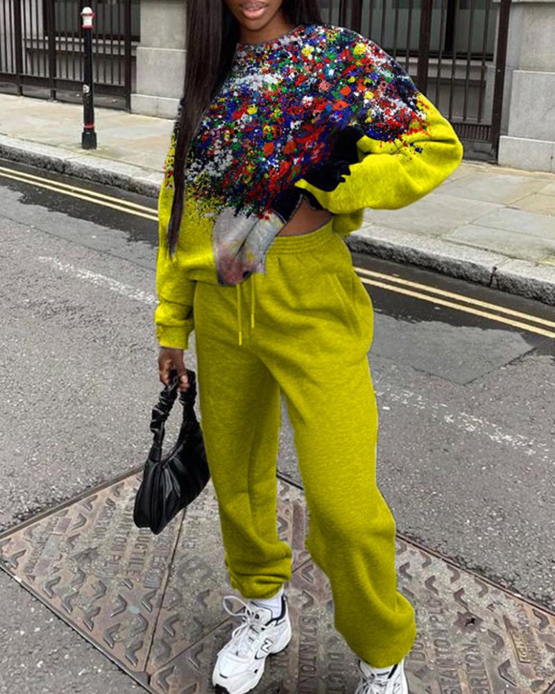 Woman Abstract Art Crew Neck Sweatshirt Two Pieces Set