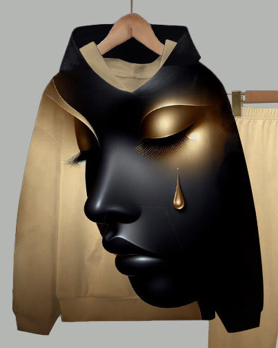 Golden Tears Black Woman Art Print Long Sleeve Hoodie Two Pieces Set