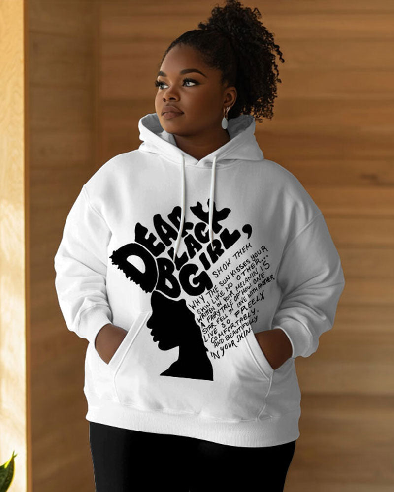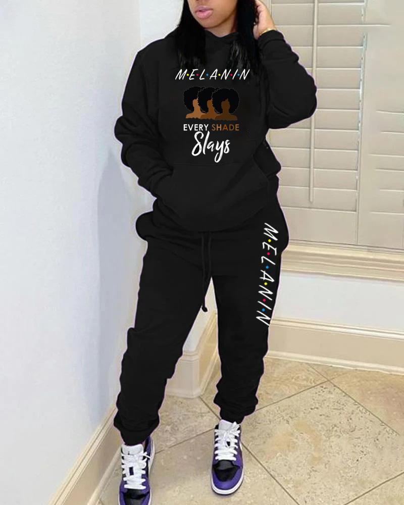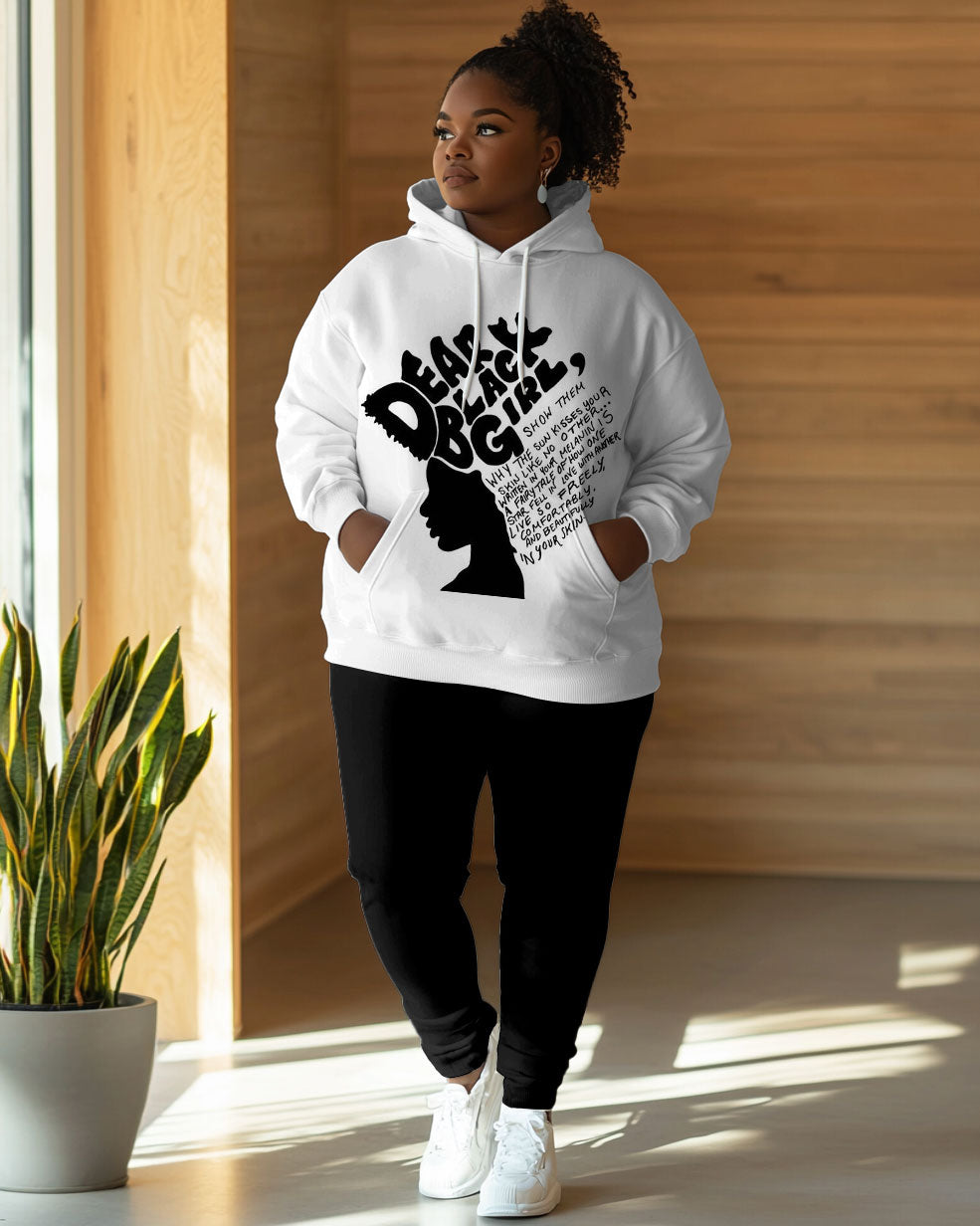 Focused Black Woman Print Long Sleeve Hoodie Two Pieces Set