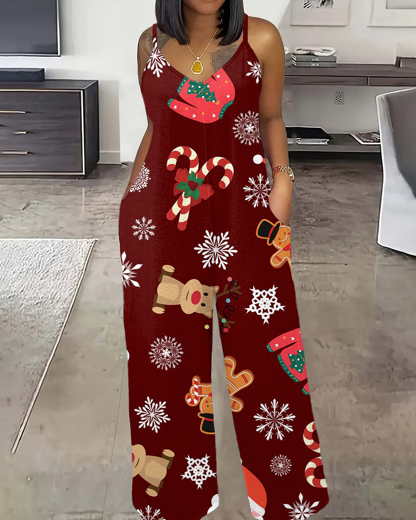 Christmas Reindeer Cookies Print Straight Suspenders Jumpsuit