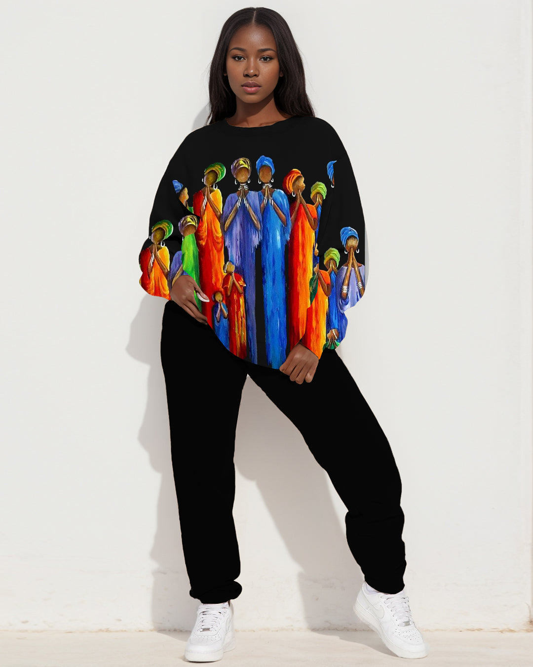 African Women Oil Painting Crew Neck Sweatshirt Two Pieces Set