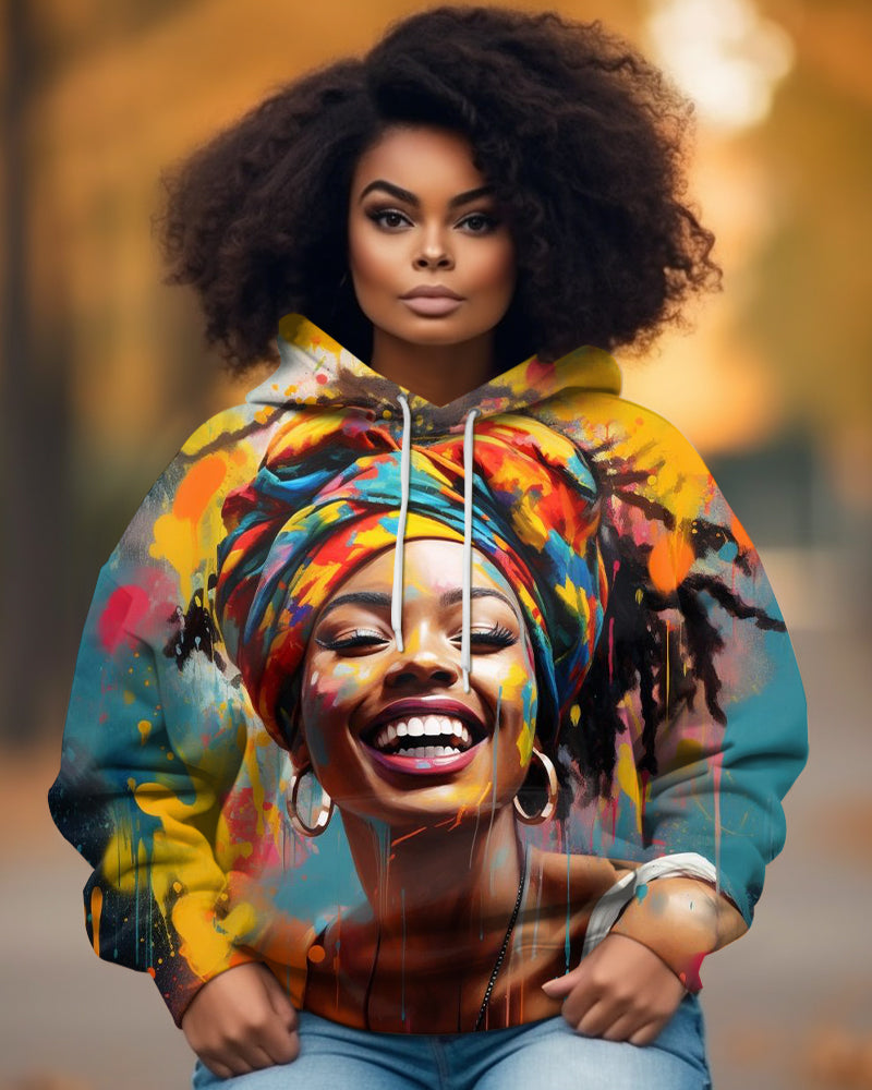 Vibrant Curly Hair African-American Woman Print Long Sleeve Hood Hoodies