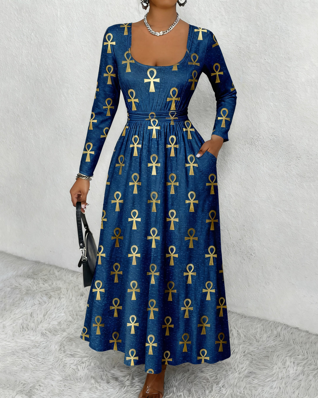 U-neck Ancient Egypt Golden Ankh Cross Pattern Long Sleeves Maxi Dress