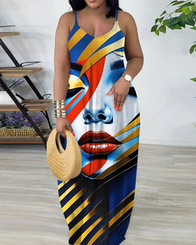 Sling Gold Striped Face Art Print Pocket Maxi Dress