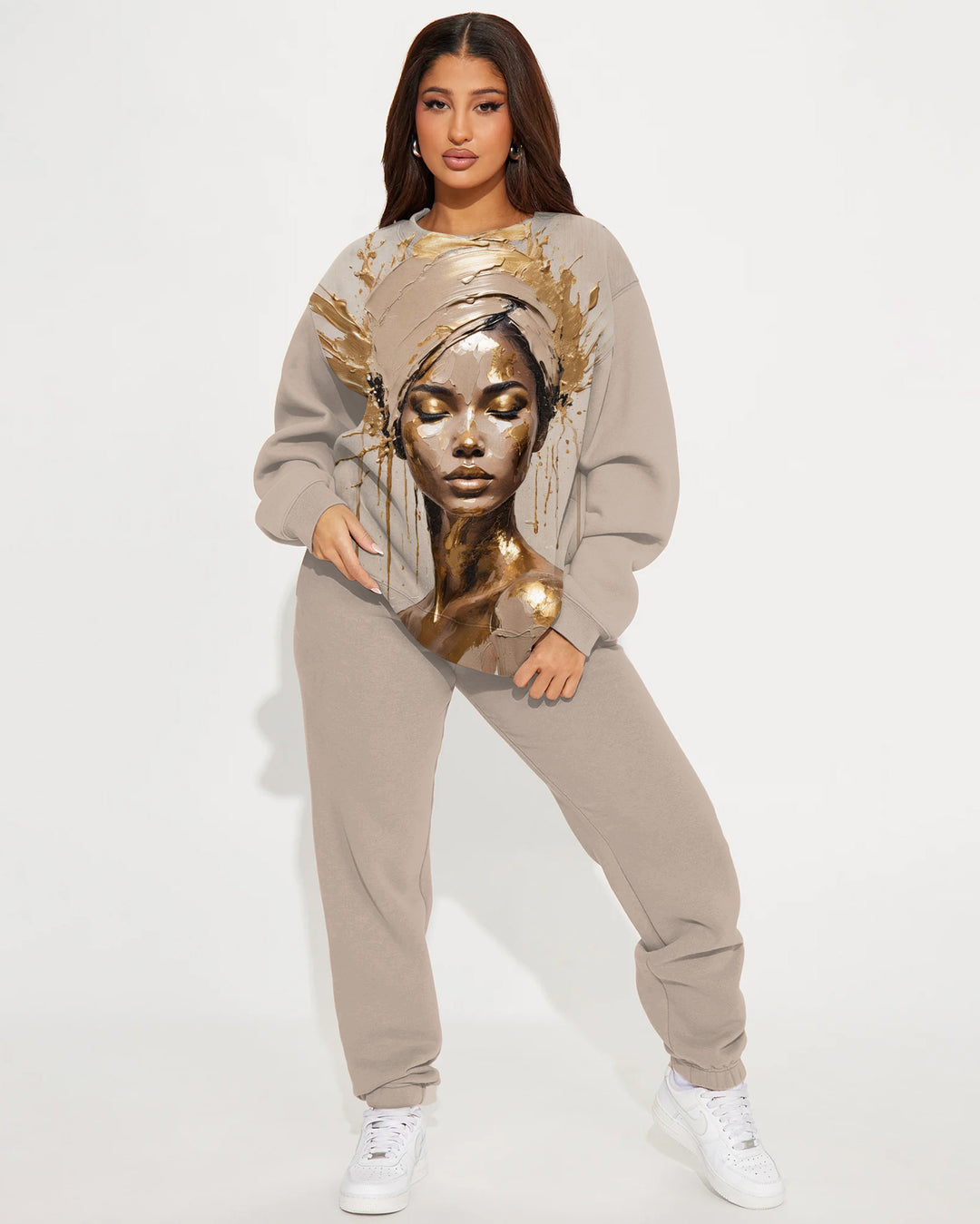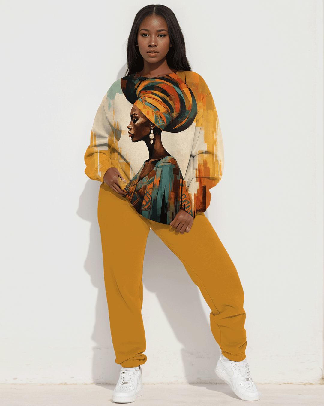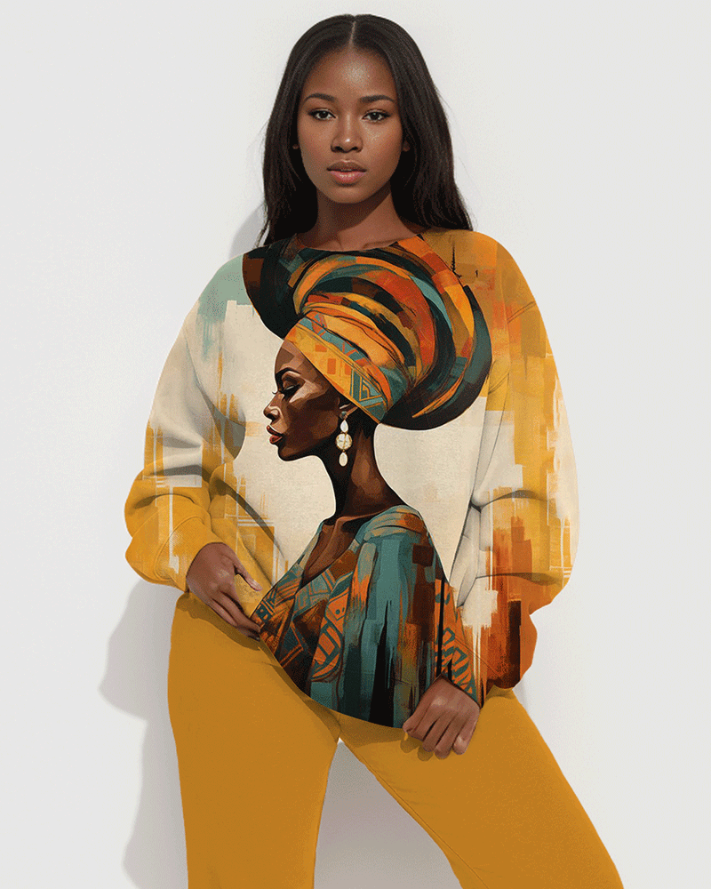 African Women Oil Painting Crew Neck Sweatshirt Two Pieces Set